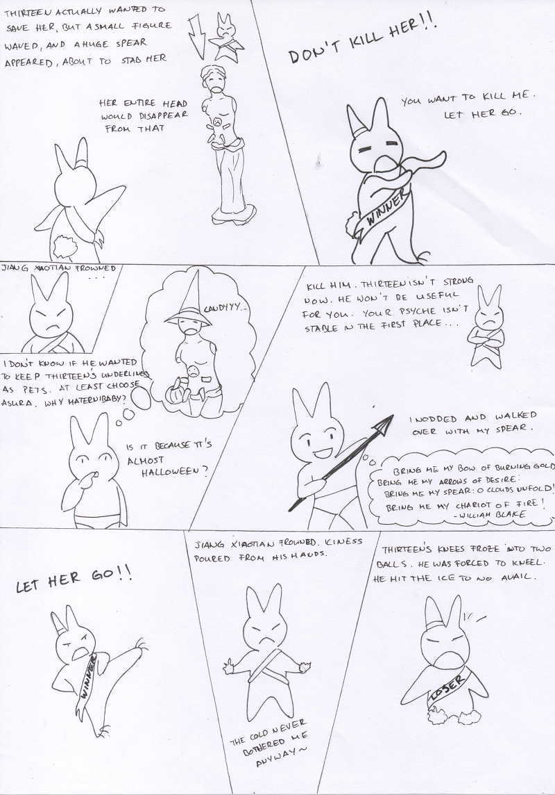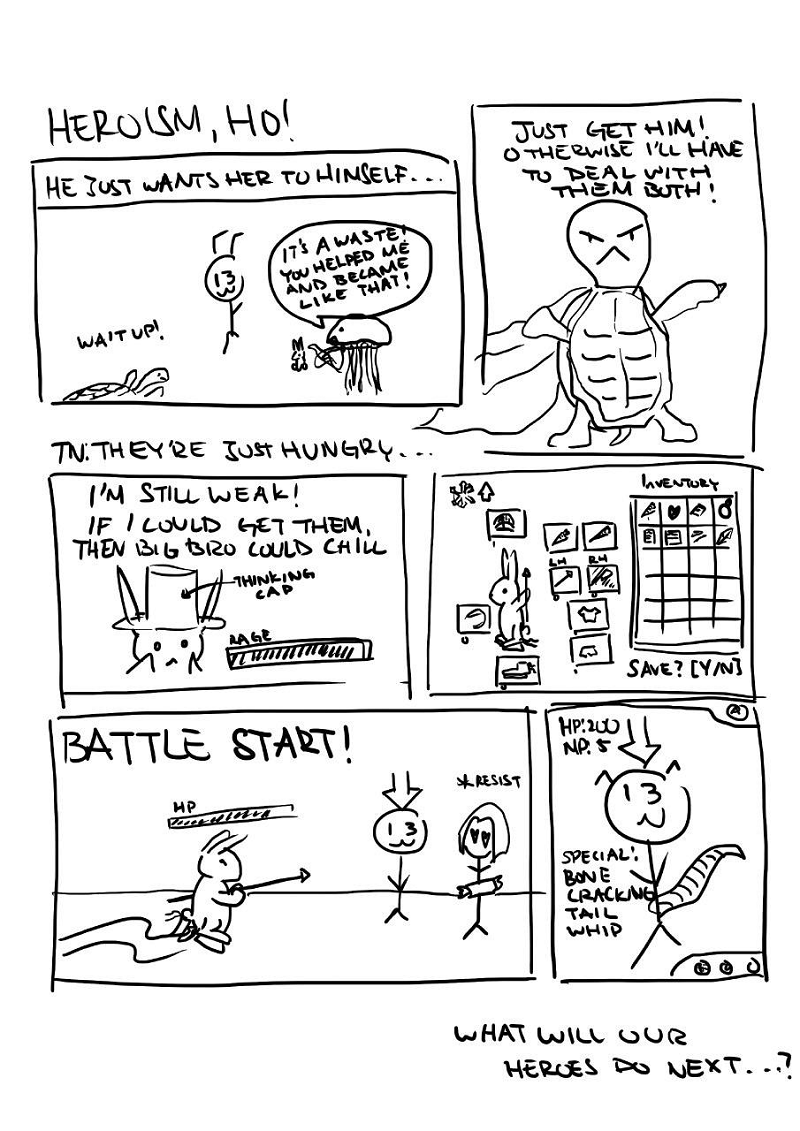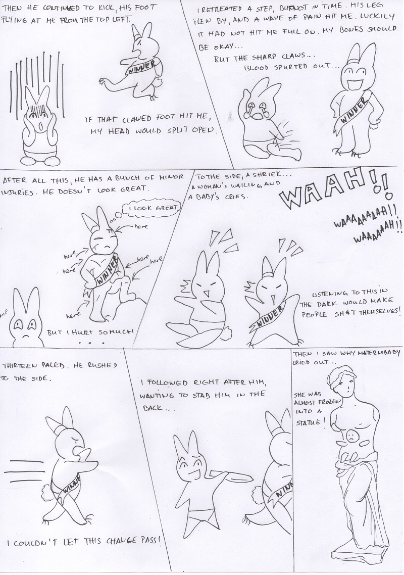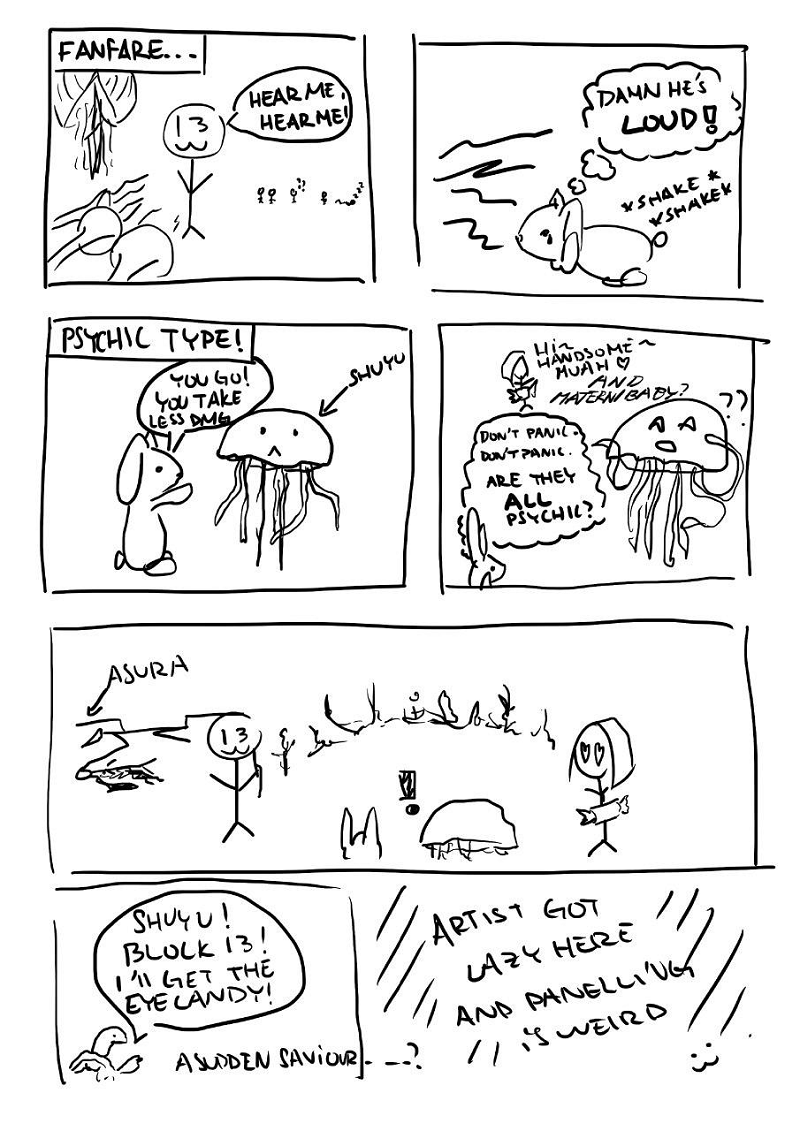 Other than the cry for help at the end (which could still work as a regular cry for help (possibly)), is this fairly accurate? It gives off the feeling of everyone being assigned a section to summarize in comic form however they see fit. As long as you pay attention to stylistic differences, it can be followed, so… I guess I’ll find out at the end of the month when the chapter is released! Anyway, good work, everyone! Looks great!